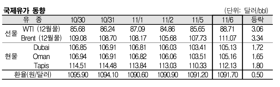 11월6일 국제유가는 미국 대선 투표결과에 대한 기대감에 따라 미국 증시가 상승한 영향으로 크게 올랐다.