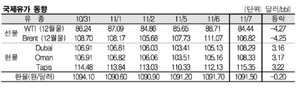 11월7일 국제유가는 세계경기의 회복 둔화 우려, 미국의 석유 재고 증가, 미국 달러화 약세로 폭락했다. 11월7일 국제유가는 미국과 유럽 등 주요국가의 경기회복 둔화 우려로 하락했다. 표, 그래프: < 국제유가 동향 > <화학저널 2012/11/08> |