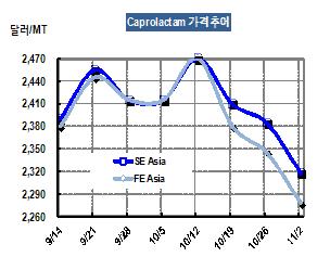 CPL(Caprolactam) 가격이 11월1일 CFR FE Asia 톤당 2278달러로 67달러 떨어졌다. CPL-벤젠 스프레드는 일반적으로 1300달러 이상을 유지해야 적자를 면할 수 있으나 11월 스프레드는 971달러로 수익성이 크게 악화된 것으로 나타나고 있다. 표, 그래프: < Caprolactam 가격추이 > <화학저널 2012/11/08> |
