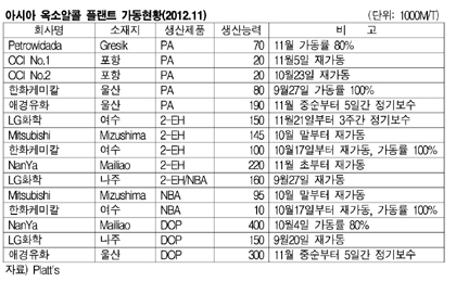 아시아 옥소알코올(Oxo-Alcohol) 시장이 재가동으로 수급밸런스가 유지될 것으로 예상된다. 한편, Mitsubishi는 Mizushima 소재 NBA(Normal Butyl Alcohol) 9만5000톤 플랜트를 10월 말부터 재가동하고 있으며 한화케미칼도 여수 소재 NBA 1만톤 플랜트를 10월17일부터 100% 가동하고 있다. 표, 그래프: < 아시아 옥소알콜 플랜트 가동현황(2012.11) > <화학저널 2012/11/08> |