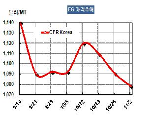 아시아 MEG(Monoethyene Glycol) 가격이 상승을 멈춘 채 하락세를 지속하고 있다. 표, 그래프: < EG 가격추이 > <화학저널 2012/11/09> |