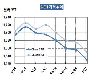 2-EH 가격이 11월1일 CFR China 톤당 1630달러로 25달러 급락했다. 중국의 입찰가는 1600-1610달러선에서 거래된 것으로 나타났으며 타이완 NanYa가 Mailiao 소재 22만톤을 재가동할 것으로 보고 있어 가격하락이 예상되고 있다. 표, 그래프: < 2-EH 가격추이 > <화학저널 2012/11/09> |
