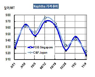 나프타 가격은 11월9일 CFR Japan 톤당 923달러로 19달러 하락했다. 그러나 허리케인 피해로 미국의 정제설비 가동률이 떨어지고 유럽의 재정위기가 해결될 기미를 보이지 않으면서 하락세 전환이 확실시되고 있다. 표, 그래프: < Naphtha 가격추이 > <화학저널 2012/11/15> |