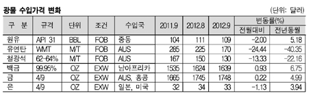 10월 광물 수입가격이 대폭 하락했다. 반면, 금은 미국 달러화 약세 및 터키, 브라질의 금 보유량 증가 소식으로 EXW 온스당 1748달러로 0.2% 올랐고, 백금은 세계 최대의 백금 생산기업이 파업에 들어가면서 공급이 타이트해져 EXW 온스당 1639달러로 0.9% 상승했다. 표, 그래프: < 광물 수입가격 변화 > <화학저널 2012/11/16> |
