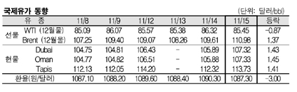 11월15일 국제유가는 주요국가의 경기침체 우려, 미국산 원유 재고 증가 등의 영향으로 하락했다. 11월15일 국제유가는 유로존 및 미국의 경기지표가 악화되면서 석유 수요 감소에 대한 우려로 하락했다. 표, 그래프: < 국제유가 동향 > <화학저널 2012/11/16> |