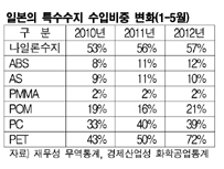 일본은 엔고의 영향으로 특수수지의 수입의존도가 눈에 띄게 상승하고 있다. 표, 그래프: < 일본의 특수수지 수입비중 변화(1-5월) > <화학저널 2012/11/19> |