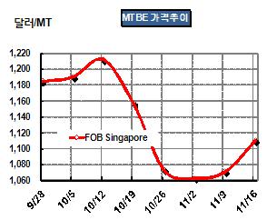 MTBE 가격이 1월16일 FOB Singapore 톤당 1116달러로 32달러 상승했다. 다만, 11월16일에는 가솔린 가격이 92 RON이 밸러당 115.97달러로 0.17달러 오르는데 그쳐 스프레드가 0.013포인트 좁혀졌다. 표, 그래프: < MTBE 가격추이 > <화학저널 2012/11/23> |