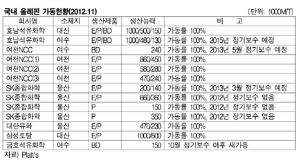 표, 그래프: < 국내 올레핀 가동현황(2012.11) > <화학저널 2012/11/23> |