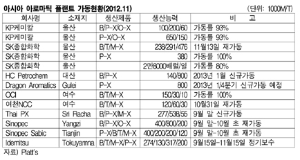 표, 그래프: < 아시아 아로마틱 플랜트 가동현황(2012.11) > <화학저널 2012/11/26> |