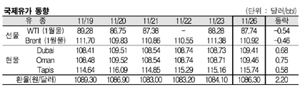 11월26일 국제유가는 미국의 재정절벽, 그리스 부채 등 세계경제 불확실성 등으로 하락했다. 11월26일 국제유가는 미국 및 그리스 등 세계경제 불확실성으로 하락했다. 표, 그래프: < 국제유가 동향 > <화학저널 2012/11/27> |