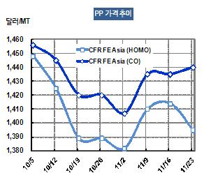 PP 가격은 11월21일 CFR FE Asia 톤당 1397달러로 17달러 급락했다. 하지만, 연말 성수기 시즌에 접어들면서 12월 초 재고 보충을 위해 수요가 증가할 것으로 기대하고 있다. 표, 그래프: < PP 가격추이 > <화학저널 2012/11/27> |