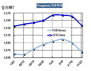 프로필렌 가격은 11월23일 FOB Korea 톤당 1265달러로 24달러 하락했다. 아시아 PP 가격은 CFR FE Asia 톤당 1389달러로 전주대비 톤당 16달러 하락한 것으로 나타났다. 표, 그래프: < Propylene 가격추이 > <화학저널 2012/11/27> |
