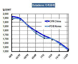 부타디엔 가격은 11월23일 FOB Korea 톤당 1570달러로 70달러 폭락했다. 동남아시아의 공급과잉이 심화되고 있는 상태에서 12월 도착 예정인 역외물량이 1500달러 수준에 유입된다는 소문이 폭락세를 이끈 것으로 알려졌다. 표, 그래프: < Butadiene 가격추이 > <화학저널 2012/11/27> |