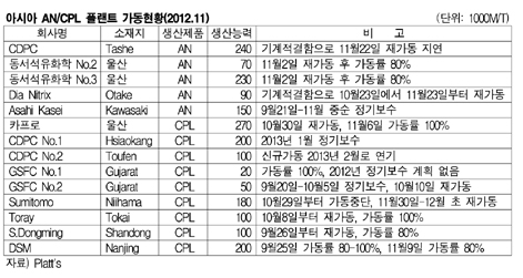 아시아 AN(Acrylonitrile) 시장이 가동지연으로 일시적으로 수급타이트로 전환될 가능성이 제기되고 있다. 한편, 아시아 CPL(Caprolactom)은 수익성 악화에도 불구하고 높은 가동률을 유지하고 있다. 표, 그래프: < 아시아 AN/CPL 플랜트 가동현황(2012.11) > <화학저널 2012/11/29> |