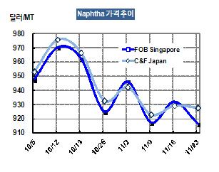 나프타 가격이 11월23일 CFR Japan 톤당 928달러로 1달러 하락했다. 아시아 나프타 시장은 석유화학 시장이 전체적으로 침체국면에서 벗어나지 못함에 따라 당분간 약세국면을 벗어나지 못할 것으로 예상되고 있다. 표, 그래프: < Naphtha 가격추이 > <화학저널 2012/11/30> |