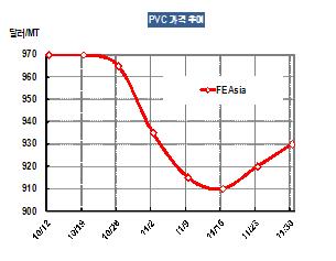 PVC 가격은 11월28일 CFR FE Asia 톤당 930달러로 10달러 상승했다.