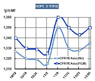 HDPE 가격은 11월28일 CFR FE Asia 톤당 1350달러로 7달러 상승했다. 그러나 대부분의 수요기업들은 필요한 최소량만 구입하고 있어 주문량이 많지 않은 것으로 알려지고 있다. 표, 그래프: < HDPE 가격추이 > <화학저널 2012/12/04> |