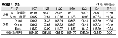 12월4일 국제유가는 미국의 재정절벽 협상 우려, 석유 수요 감소 전망 등으로 하락했다. 12월4일 국제유가는 미국의 재정절벽 협상을 둘러싼 불안감이 증폭되면서 하락했다. 표, 그래프: < 국제유가 동향 > <화학저널 2012/12/05> |