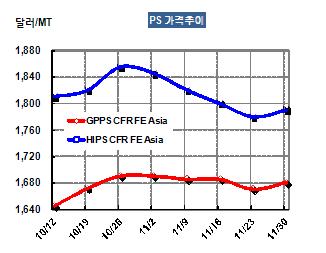 GPPS 가격은 11월28일 CFR China 톤당 1680달러로 10달러 상승했다. 그러나 중국의 10월 GPPS 수입량이 6만8129톤으로 전월대비 16%, 전년동월대비 12% 줄어드는 등 수요침체가 장기화되고 있어 강세를 지속하기는 어려울 것으로 예상된다. 표, 그래프: < PS 가격추이 > <화학저널 2012/12/05> |