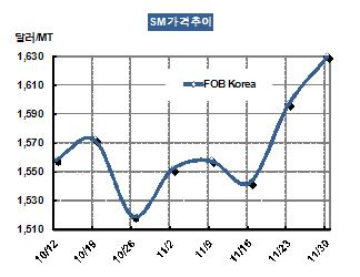 SM 가격은 11월30일 FOB Korea 톤당 1630달러로 33달러 상승했다. 그러나 중국의 SM 내수가격은 동부지역 기준으로 ex-works 톤당 1만2575위안으로 250위안(40달러) 떨어져 수입가격 기준 1675달러를 형성했다. 표, 그래프: < SM 가격추이 > <화학저널 2012/12/05> |
