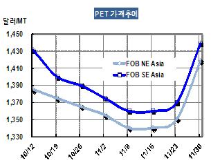 아시아 PET(Polyethylene Terephthalate) 가격이 11월28일 FOB NE Asia 톤당 1419달러로 69달러 급등했다. 시장 관계자는 “12월 현물은 낮은 가동률 때문에 거래가 제한적이었다”고 밝혔다. 표, 그래프: < PET 가격추이 > <화학저널 2012/12/06> |