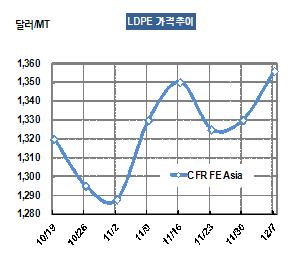 LDPE 가격은 12월5일 CFR FE Asia 톤당 1356달러로 26달러 급등했다. 이란 정부가 석유화학제품 수출을 제한하겠다고 발표한 이후 11월부터 이란제품의 중국시장 유입이 20% 정도 줄어들었기 때문이다. 표, 그래프: < LDPE 가격추이 > <화학저널 2012/12/10> |