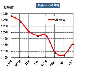 에틸렌 가격은 12월7일 FOB Korea 톤당 1165달러로 53달러 급등했다.