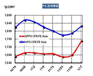 GPPS 가격은 12월5일 CFR China 톤당 1751달러로 71달러 폭등했다. 특히, 벤젠(Benzene) 가격이 FOB Korea 톤당 FOB Korea 톤당 1456달러로 28달러 상승해 사상 최고가격 행진을 지속하고 있는 것이 크게 작용했다. 표, 그래프: < PS 가격추이 > <화학저널 2012/12/12> |