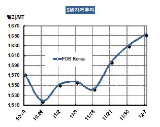 SM 가격은 12월7일 FOB Korea 톤당 1653달러로 23달러 상승했다. 벤젠 가격이 1400달러대 중반을 넘어선 것은 초유의 사태로, 미국가격이 1500달러를 다시 넘어섬으로써 수출증가가 기대돼 초강세를 지속하고 있다. 표, 그래프: < SM 가격추이 > <화학저널 2012/12/12> |