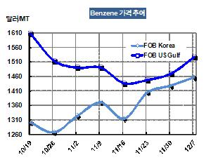 벤젠 가격은 12월7일 FOB Korea 톤당 1456달러로 28달러 상승했다.