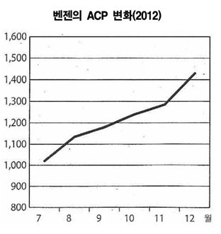 벤젠(Benzene)의 아시아 계약가격(ACP)이 2012년 12월 톤당 1430달러로 최고치를 기록했다. 표, 그래프: < 벤젠의 ACP 변화(2012) > <화학저널 2012/12/12> |