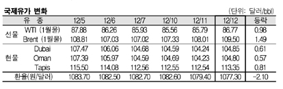 12월12일 국제유가는 미국의 추가 부양책 실시 결정, IEA의 석유수요 전망치 상향조정, 미국의 달러화 약세 등의 영향으로 상승했다. 12월12일 국제유가는 미국 연방준비제도의 추가 부양책 실시 결정 영향으로 상승했다. 표, 그래프: < 국제유가 변화 > <화학저널 2012/12/13> |