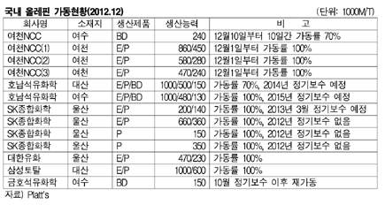 국내 올레핀(Olefin) 가동률이 여전히 높은 수준을 유지해 공급과잉이 우려되고 있다. 한편, 여천NCC의 여수 소재 부타디엔 24만톤 플랜트는 12월10일부터 10일 동안 70% 가동할 예정이며, 호남석유화학도 대산 소재 에틸렌 100만톤 및 프로필렌 50만톤 크래커, 부타디엔 15만톤 플랜트를 70%로 가동해 부타디엔은 수급밸런스를 유지할 것으로 예상되고 있다. 표, 그래프: < 국내 올레핀 가동현황(2012.12) > <화학저널 2012/12/14> |