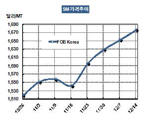 SM 가격은 12월14일 FOB Korea 톤당 1677달러로 25달러 상승했다.