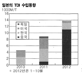 TDI(Toluene Diisocyanate)의 일본수출이 급감하고 있다. 표, 그래프: < 일본의 TDI 수입동향 > <화학저널 2012/12/18> |