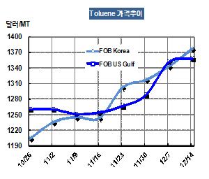 톨루엔 가격은 12월14일 FOB Korea 톤당 1377달러로 34달러 상승했다. 벤젠이 초강세를 지속함에 따라 TDP(Toluene Disproportionaton) 및 HDA(Hydrodealkylation), 그리고 P-X (Para-Xylene)으로 전환하는 MTPX(Mobile Toluene to Paraxylene) 플랜트의 가동률이 활성화되고 있기 때문이다. 표, 그래프: < Toluene 가격추이 > <화학저널 2012/12/20> |