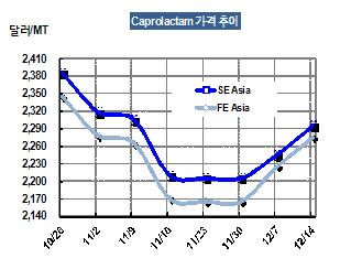 CPL(Caprolactam) 가격이 12월13일 CFR FE Asia 톤당 2275달러로 50달러 급등했다. 벤젠은 FOB Korea 톤당 1462달러를 형성해 CFR FE Asia와 FOB Korea 가격 스프레드가 톤당 814달러를 유지했고, CPL 생산기업들이 요구하는 1300달러 수준보다 매우 비싸게 거래됐다. 표, 그래프: < Caprolactam 가격추이 > <화학저널 2012/12/20> |