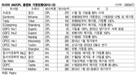 아시아 AN(Acrylonitrile) 시장의 수급타이트가 심화되고 있다. 아시아 CPL(Caprolactom) 시장이 가동률 하향조정을 지속하고 있다. 표, 그래프: < 아시아 AN/CPL 플랜트 가동현황(2012.12) > <화학저널 2012/12/20> |