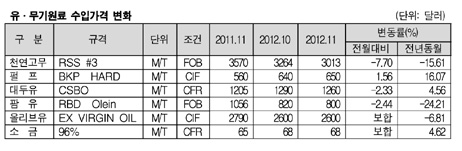 천연고무 수입가격이 하락세로 전환됐다. 반면, 펄프는 가격 변화요인이 없었던 가운데 CIF 톤당 650달러로 10월 640달러에 비해 1.6% 상승을 기록했다. 표, 그래프: < 유․무기원료 수입가격 변화 > <화학저널 2012/12/20> |