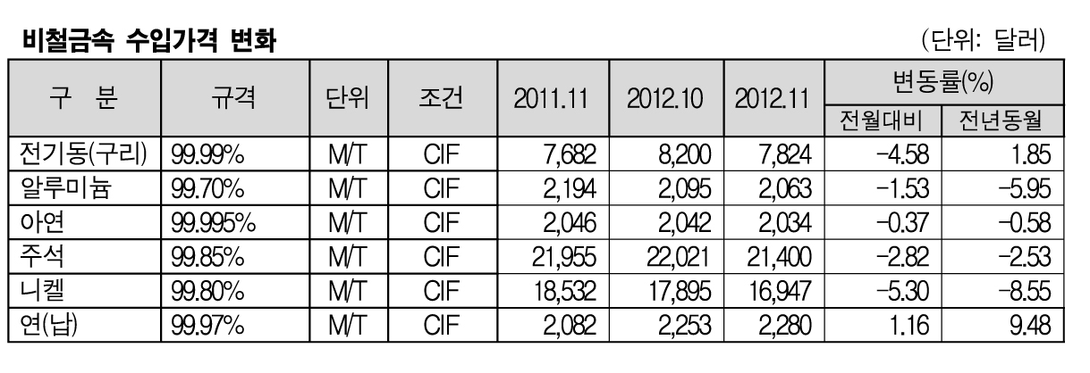 비철금속 수입가격이 10월 하락세로 전환된데 이어 11월에도 약세를 이어갔다. 반면, 연(납)은 글로벌 트렌드 강세 영향 및 배터리 생산기업의 수요 증가에 힘입어 CIF 톤당 2280달러로 1.2% 오른 것으로 나타났다. <우연서 기자> 표, 그래프: < 비철금속 수입가격 변화 > <화학저널 2012/12/21> |