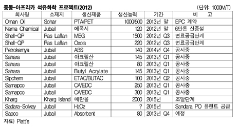 중동 및 아프리카 지역에서 석유화학 프로젝트 투자가 활발히 진행되고 있다. SABIC의 자회사 Petrokemya도 Al Jubail 공업단지에 ABS(Acrylonitrile Butadiene Styrene) 14만톤 플랜트를 2014년 4/4분기 완공 목표로 건설하고 있으며, Shell Chemicals은 카타르 국영 QP(Qatar Petroleum)와 합작으로 카타르 Doha의 북쪽에 위치한 Ras Laffan 공업도시에 MEG(Monoethylene Glycol) 150만톤 및 Oxol Alcohol 22만톤 플랜트를 2016년까지 완공할 계획이다. 표, 그래프: < 중동-아프리카 석유화학 프로젝트(2012) > <화학저널 2012/12/21> |