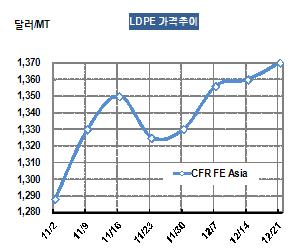 LDPE 가격은 12월19일 CFR FE Asia 톤당 1370달러로 10달러 상승했다. 중동산이 90일 신용거래 기준으로 톤당 1425달러롤 요구했고, 이란 석유화학기업들도 90일 신용거래 기준 1360-1370달러를 요구한 영향이 컸다. 표, 그래프: < LDPE 가격추이 > <화학저널 2012/12/24> |