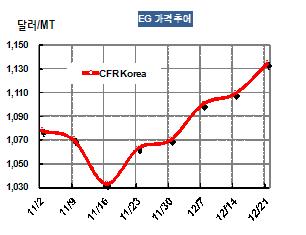 MEG 가격은 12월21일 CFR China 톤당 1134달러로 25달러 상승했다. 그러나 중국의 MEG 재고가 약 8만톤으로 높은 수준을 유지함으로써 구매를 서두를 이유가 없어 1100달러대의 강세를 지속하기는 어려울 것으로 예측된다. 표, 그래프: < EG 가격추이 > <화학저널 2012/12/24> |