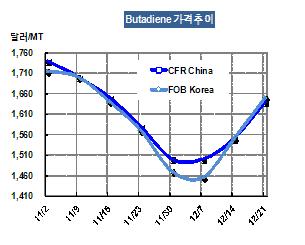 부타디엔 가격은 12월21일 FOB Korea 톤당 1650달러로 100달러 폭등했다. 호남석유화학은 2013년 1월 공급물량 1500톤을 FOB Korea 톤당 1650달러에, 여천NCC도 1월 하순 공급물량을 1650달러에 판매한 것으로 알려졌다. 표, 그래프: < Butadiene 가격추이 > <화학저널 2012/12/24> |