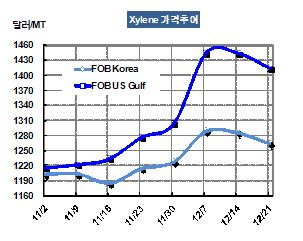 M-X 가격은 12월21일 FOB Korea 톤당 1263달러로 22달러 하락했다. 2주 전에는 FOB Korea 톤당 1288달러, CFR China 1318달러로 1997년 이후 최고가격을 형성했었다. 표, 그래프: < Xylene 가격추이 > <화학저널 2012/12/26> |