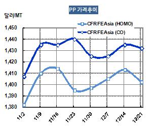 PP 가격은 12월19일 CFR FE Asia 톤당 1402달러로 19달러 급락했다. 중동산 Homo 그레이드가 CFR FE Asia 톤당 1420달러, OPP 그레이드가 1430달러에 제시됐으나 높은 가격에 대한 부담으로 거래가 이루어지지 않았으며 1400달러 수준에서 거래가 진행된 것으로 알려졌다. 표, 그래프: < PP 가격추이 > <화학저널 2012/12/26> |