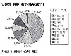 일본의 UPR(Unsaturated Polyester Resins) 수요가 꾸준히 중가하고 있다. 표, 그래프: < 일본의 FRP 출하비중(2011) > <화학저널 2012/12/26> |