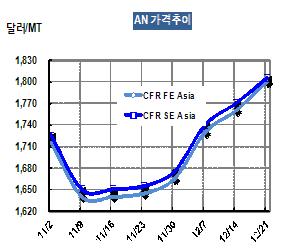 AN 가격은 12월18일 CFR FE Asia 톤당 1800달러로 40달러 상승했다.