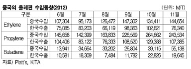 올레핀(Olefin)의 중국수출이 급감했다. 11월 중국 전체 올레핀 수입에서 한국산의 비중은 줄어들었다. 표, 그래프: < 중국의 올레핀 수입동향(2012) > <화학저널 2013/01/02> |