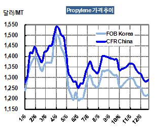 2012년 프로필렌(Propylene) 가격은 FOB Korea 톤당 1220달러에서 거래를 마무리했다.